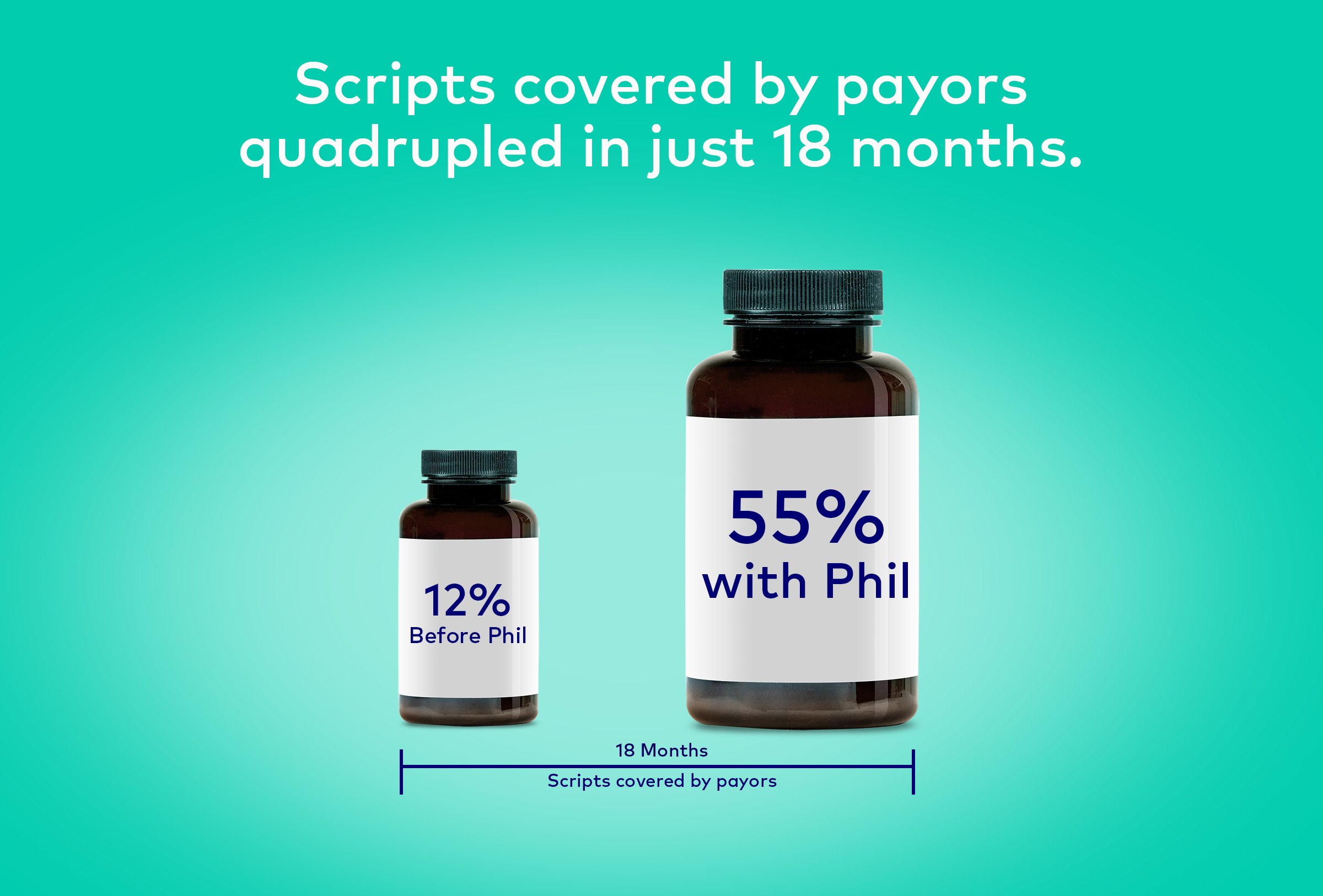 Patient engagement was notably improved with the help of text messages to guide the patient through every step of the process. From the seamless 1 minute onboarding to the post-dispense texts tailored to the patient’s clinical journey, Phil was able to remove most of the administrative burdens and allow for a greater focus on the promotion of therapy adherence. Scripts covered by payers quadrupled in just 18 months – from 12% to 55% – with the refill rate adherence increasing by 45%.