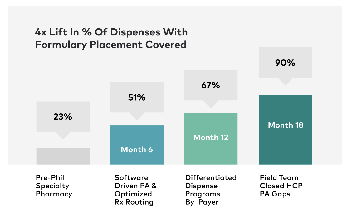 Facing a genuinely existential threat if they did not improve performance, the brand needed a strategic partner that could support a turnaround. They needed a platform to help them convert formulary placement to covered dispenses to improve their patient and financial outcomes. With limited visibility into the drug channel with a specialty pharmacy partner, they also needed more data to respond to payer PA behavior to be able to differentiate dispense programs to allow them to balance supporting easy access therapy with sound financial stewardship.
